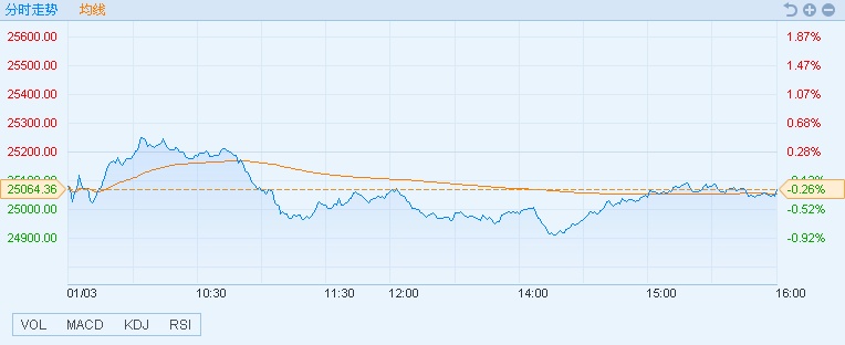 智通财经APP获悉,恒指早盘反抽无力后继续跳水,午后跌幅进一步加深,盘中最低见24896点,大市跌破25000点大关。临近收盘指数小幅回暖,跌幅收窄,大市重回25000点关口上方。截至收盘,恒生指数跌65.99点或0.26%,报25064.359点,全日成交额达683.53亿。国企指数涨0.02%,报9835.45点,红筹指数涨0.4%,报4026.81点。