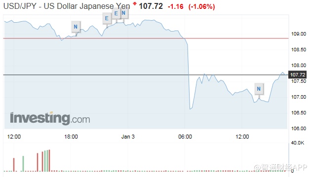 智通财经APP获悉,周四欧市早盘,日元小幅回落,美元/日元跌幅已收窄至1%,报107.72。亚市早盘,美元/日元一度跌破107关口,触及日内低点106.75,而周三盘中还曾触及105.00关口。有分析称,最近日元大涨,似乎是迟到的避险属性终于爆发了:2018年12月美股创1930年代以来最糟糕的12月表现,且美国长期债券收益率暴跌,引发避险情绪升温,目前日元终于受到了避险情绪的刺激。
