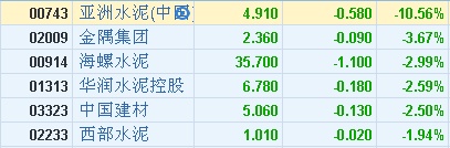 智通财经APP获悉,水泥板块今日集体下挫,海螺水泥(00914)最低触至35.5港元,创52周新低,收跌2.99%,报35.7港元。亚洲水泥(00743)收跌10.56,%,报4.91港元;金隅集团(02009)收跌3.67%,报2.36港元;华润水泥(01313)收跌2.59%,报6.78港元;中国建材(03323)跌2.5%,报5.06港元;西部水泥(02233)跌1.94%,报1.01港元。