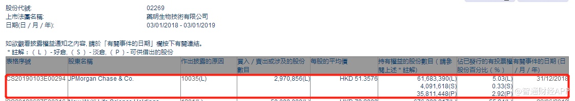 智通财经APP获悉,根据联交所资料显示,摩根大通于2018年12月31日增持药明生物(02269)297万股,每股作价51.36港元,总值约1.5亿港元,最新持股量增至5.03%,最新持股数目6168万股。