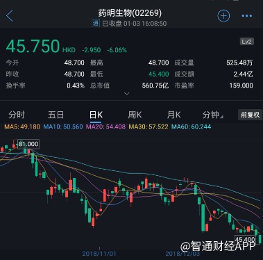 截至今日收盘,药明生物(02269)报45.750港元,跌6.06%。