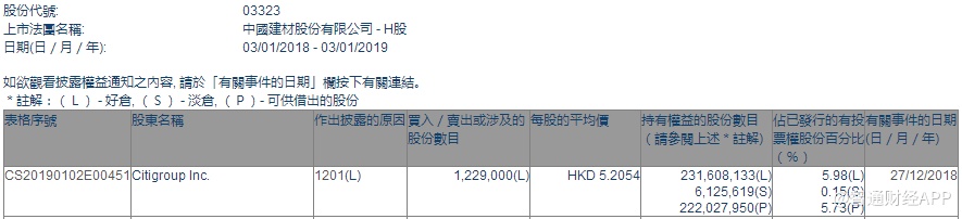 智通财经APP获悉,港交所权益披露显示,花旗集团于2018年12月27日减持中国建材(03323)122万股,每股作价5.21港元,涉资约635.62万港元,最新持股数目约2.31亿股,持股占比降至5.98%。