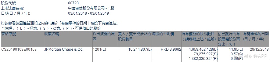 智通财经APP获悉,港交所权益披露显示,摩根大通于2018年12月28日减持中国电信(00728)1624万股,每股作价3.97港元,涉资约6447.28港元,最新持股数目约16.59亿股,持股占比降至11.95%。