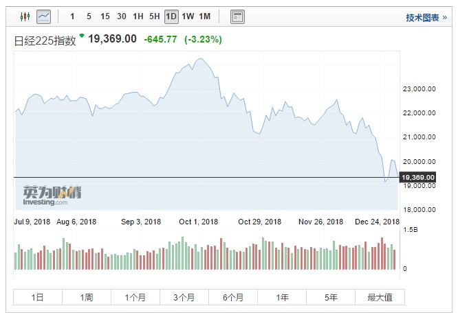 智通财经APP获悉,受美股暴跌影响,日经225指数2019年首个交易日低开1.8%,东证指数低开1.7%。截至发稿,日经指数跌3.23%。东证指数跌2.6%。