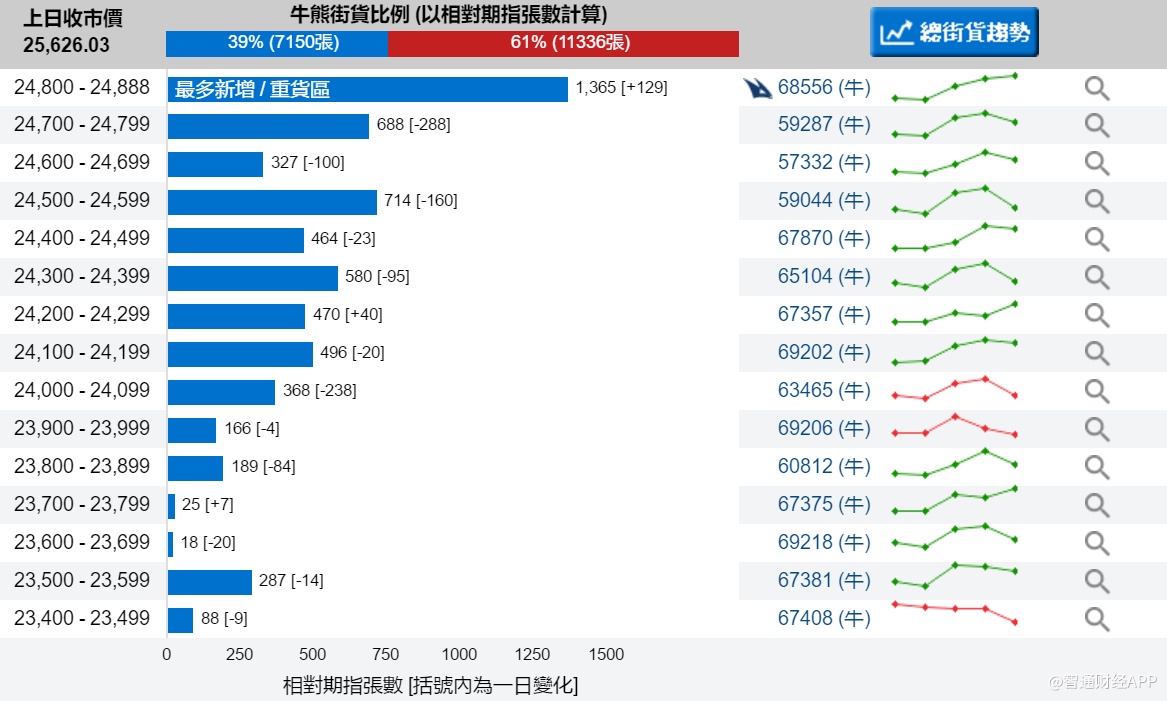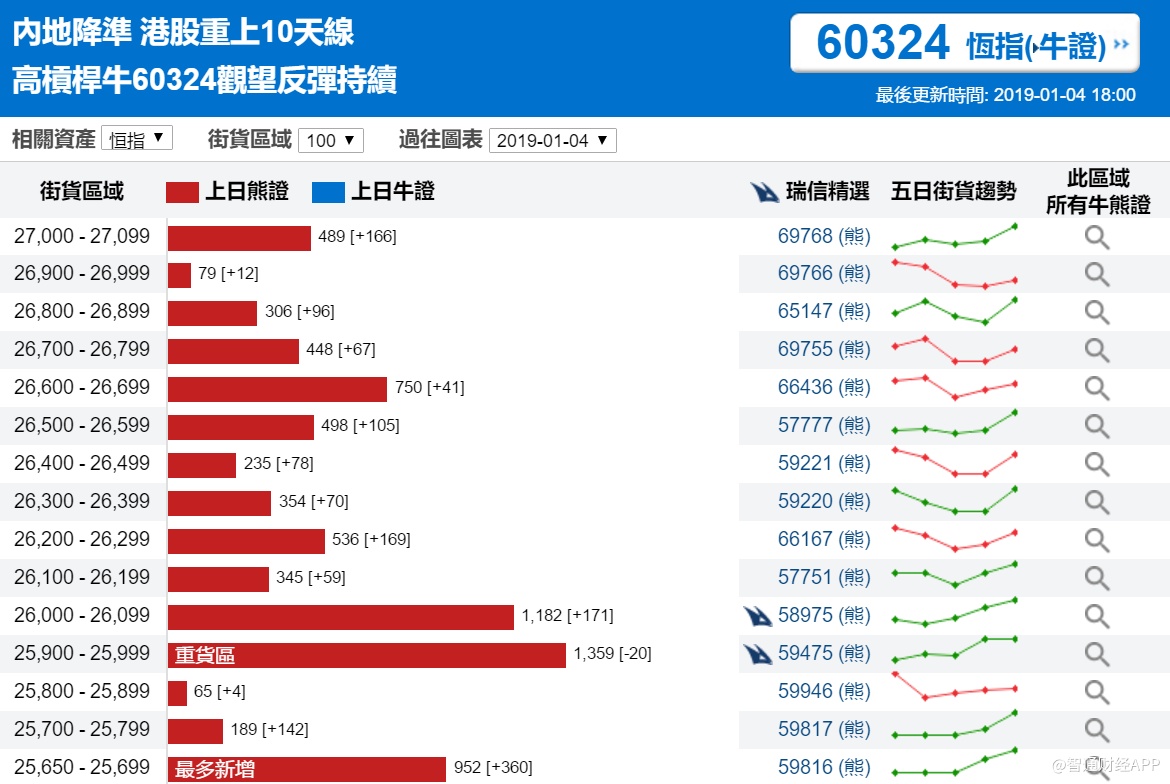 智通财经APP获悉,截至1月4日,恒指最新的牛熊街货比例39:61。从瑞信恒指牛熊证街货分布图中得到的数据显示,熊证街货重货区在25900-25999区间,该区间最新熊证数量为1359张,减少20张,最多新增在25650-25699区间。牛证街货重货区与最多新增均在24800-24888区间,该区间最新牛证数量为1365张,比上一交易日增加129张。