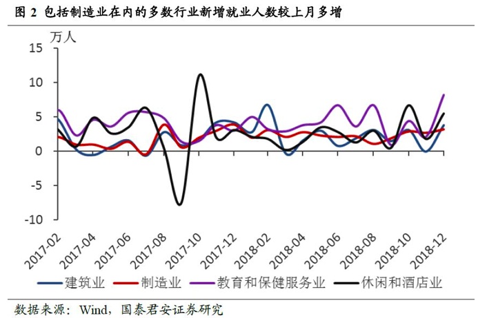 多数行业较上月多增,仅个别行业较上月少增。分行业看,商品生产大类下各行业均较上月多增,其中制造业新增就业3.2万人,较上月多增0.5万人;建筑业新增就业3.8万人,上月为零增长(图2)。服务生产大类下多数行业也较上月多增,其中教育和保健服务业新增就业8.2万人,较上月多增6.1万人;休闲和酒店业新增就业5.5万人,较上月多增3.7万人;只有运输仓储业、零售业和批发业等个别行业较上月少增。此外,美国11月新增非农就业人数从+15.5万人上修至+17.6万人,10月从+23.7万人上修至+27.4万人,前两个月合计上修5.8万人。