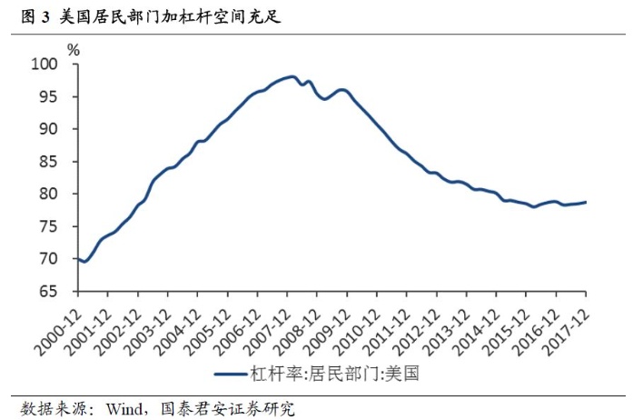 美国经济虽然放缓,但韧性犹存。尽管受财政刺激政策效果逐渐减退、贸易保护主义和全球经济放缓等因素影响,美国经济出现明显放缓迹象,例如:住宅投资陷入低迷,设备投资增长放缓,出口明显回落,但考虑到美国就业表现优异和居民加杠杆空间充足(图3),美国消费存在较强支撑,叠加政府支出保持较大力度,这意味着美国经济具有较强韧性,并不会出现失速风险。我们预计2019年美国经济增长较2018年放缓0.4个百分点,但仍保持在2.5%的不错水平上。