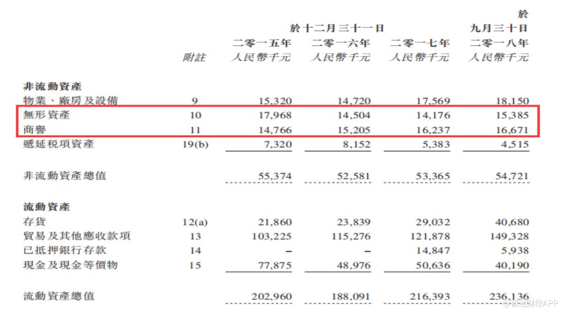 看上去,泰乐玛是一家业绩稳定,财务状况良好的公司。不过,智通财经APP进一步查阅泰乐玛财务报告发现,截止2018年9月30日,公司非流动资产中无形资产和商誉分别为1538.5万元和1667.1万元,占到公司非流动资产总值的58.58%,而物业、产房及设备等固定资产的金额为1815万元,占比仅为33.17%。