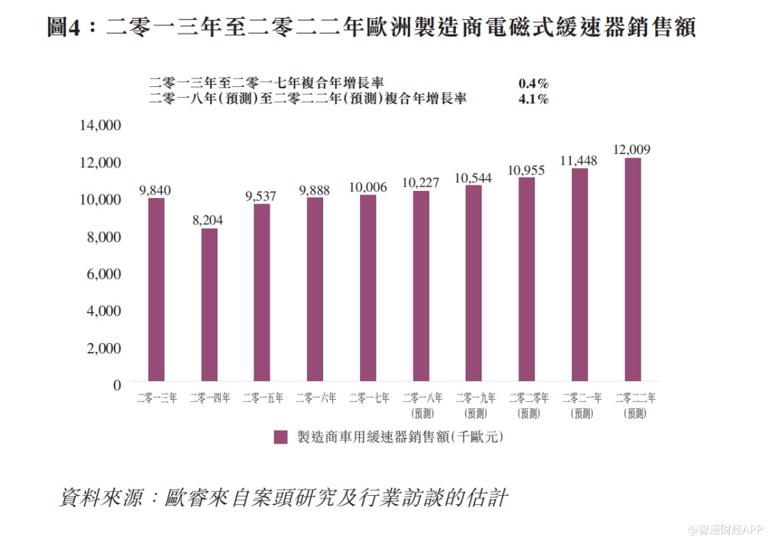 根据欧瑞的报告,欧洲的电磁式缓速器2013年至2017年销售额以0.4%的复合年增长率增长,预计2018年至2022年将进一步以4.1%的