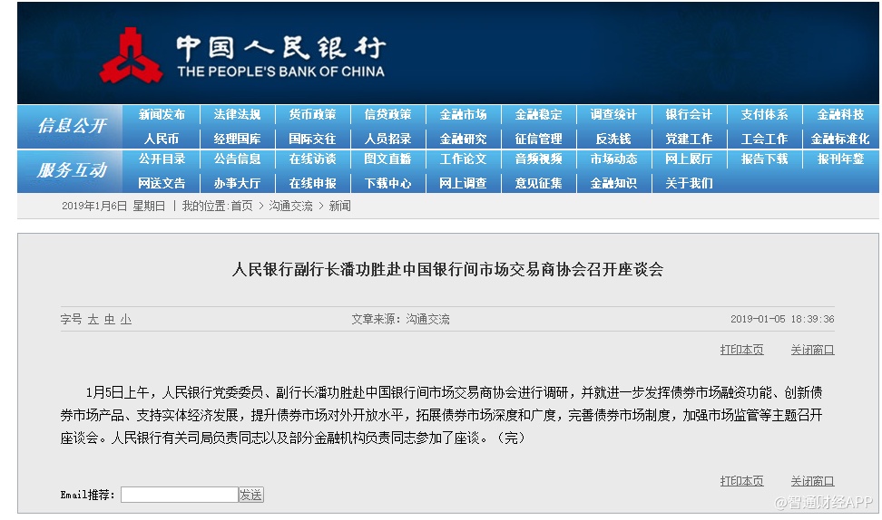 智通财经APP曾报道,据央行消息,1月5日上午,潘功胜赴中国银行间市场交易商协会进行调研,并就进一步发挥债券市场融资功能、创新债券市场产品、支持实体经济发展,提升债券市场对外开放水平,拓展债券市场深度和广度,完善债券市场制度,加强市场监管等主题召开座谈会。
