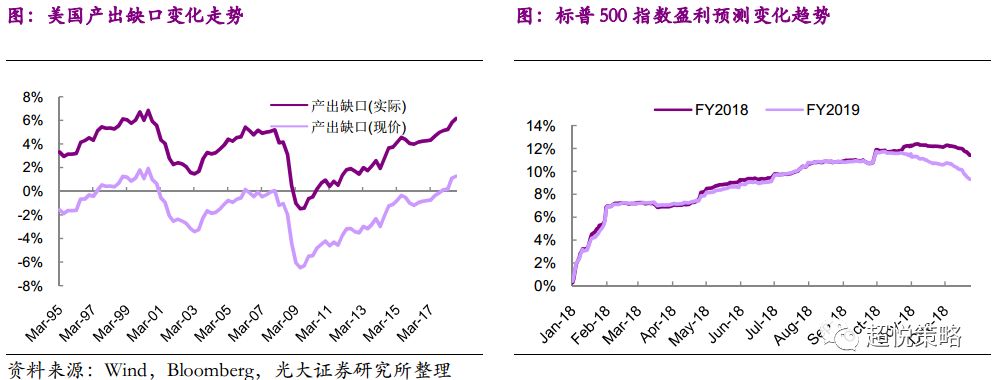 但是,市场显然担忧得更多,主要体现为全球来讲,新兴市场国家都已经在本轮美元强势走势中受到比较严重的影响,不管是经济基本面还是股票市场的表现,整体都是出现比较大幅度的下行,再加上中美贸易冲突的问题,终究会对美国经济造成影响。从一些指标来看,比如美长短国债利差收窄甚至倒挂、美国产出缺口走势、经济数据拟合的一些前瞻指标等,都显示出美国在金融危机后的复苏周期已经处于高潮阶段,后续或许会面临较大的往下的压力。10月份以来,资本市场已经开始下修美股2018、2019年的业绩预测。