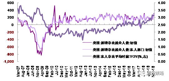 图:美国非农就业人数走势(千人)及平均时薪增速走势