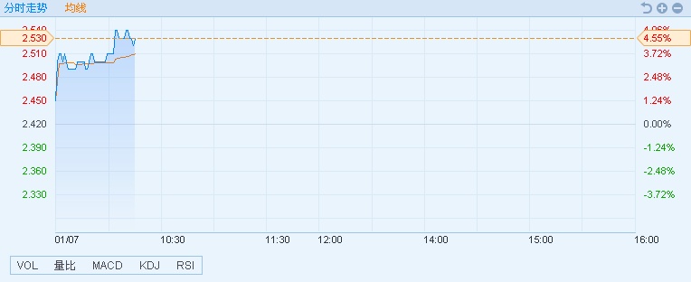 智通财经APP获悉,中国铝业(02600)早盘小幅低开后震荡上冲,截至10时14分,涨4.55%,报2.53港元,成交额2265.49万港元。