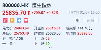 智通财经APP获悉,恒指今日高开低走,曾一度重回两万六,早盘涨389.81点或1.52%,报26015.84点。截至收盘,恒生指数涨205.49点或0.82%,报25835.7点,全日成交额达774.76亿。国企指数涨0.94%,报10123.85点,红筹指数涨0.63%,报4132.22点。