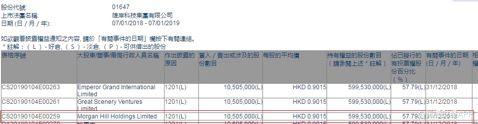 智通财经APP获悉,根据联交所资料显示,Morgan Hill Holdings Ltd于2018年12月31日减持雄岸科技(01647)1050万股,每股作价0.9015港元,总值946.58万港元,最新持股数减至5.99亿股,最新持股比例减至57.79%。