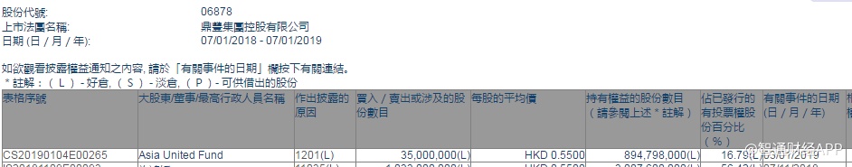 智通财经APP获悉,根据联交所资料显示,Asia United Fund于1月3日减持鼎丰集团控股(06878)3500万股,每股作价0.55港元,总值1925万港元,最新持股数减至8.94亿股,最新持股比例减至16.79%。