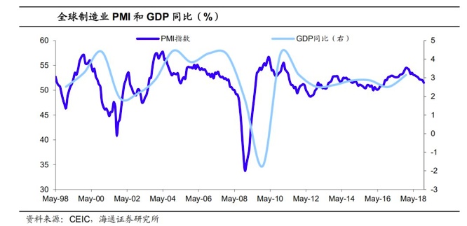 新兴市场:经济表现较弱,回落幅度不大。新兴市场国家及地区制造业PMI指数相对较低,但是18年指数下降幅度较小,反映经济恶化情况好于发达国家。但土耳其、中国台湾和马来西亚PMI指数下降幅度较大,他们代表了大部分新兴市场国家及地区目前所面临的问题。土耳其:本币大幅贬值。土耳其的问题是在美元加息周期下,前期过度举债引发本国货币承压,货币大幅贬值导致该国通胀和利率攀升,抑制消费和投资。马来西亚:资源品大跌。马来西亚的问题是过度依赖原油出口收入,国际原油价格下跌导致其国内收入下降,抑制需求。中国台湾:外需回落。中国台湾的问题是在全球经济增长放缓的情况下,出口的大幅回落导致经济遭受冲击。