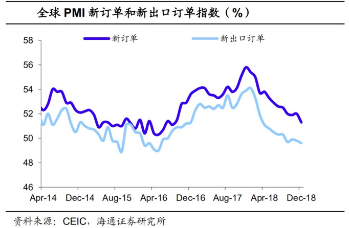 分项来看,18年新订单指数和新出口订单指数双双大幅回落。制造业PMI指数分项涉及企业生产的多个方面,其中最重要的是衡量需求的新订单指数和新出口订单指数,其中新订单指标占总指数的权重达到30%。18年全球制造业PMI新订单指数从年初的55.4下降至12月的51.3,反映出全球整体需求持续走弱,而新出口订单指数更是下滑至荣枯线以下,说明全球经济走弱和贸易条件不断恶化导致出口需求持续萎缩。