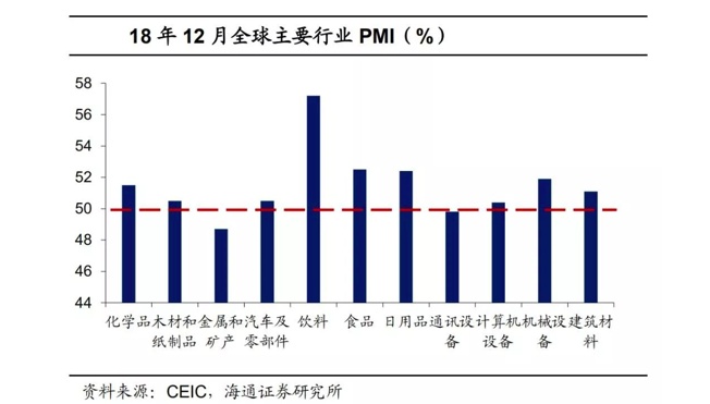 全球PMI明显回落。PMI指数是微观层面企业运行状况的汇总数据,历史数据显示制造业PMI指数略领先于GDP增速,是经济重要的观测指标。18年12月全球制造业PMI指数下降至51.5,全年PMI指数回落接近3个百分点,反映出18年全球经济增长势头减弱。分项来看,18年新订单指数和新出口订单指数双双回落,需求的回落导致生产指数出现下降,产成品库存指数上升。而分行业来看,除必需品行业以外,18年大部分行业PMI指数都出现明显下降,其中通讯设备、计算机设备和汽车及零部件行业领跌。通讯、计算机和汽车行业景气度大幅下降与17年这些行业处于高点有关,但是更重要的是因为18年国际贸易冲突升温。
