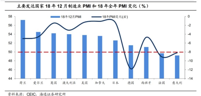 大部分发达国家制造业PMI仍然处于荣枯线以上,但是18年均出现下滑。具体来说,除了意大利和法国的制造业PMI下滑至49.2和49.7以外,18年12月其他主要发达国家制造业PMI指数均仍处荣枯线以上。尽管各国PMI指数都处于经济扩张区间,但是18年各国经济增长势头都明显减弱,主要发达国家PMI指数均出现下降。其中下降幅度最大的是德国、法国和意大利,全年下降幅度分别达到11.8、9.1和8.2个百分点。