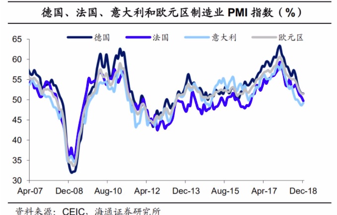 PMI指数下降幅度最大的三个国家均属于欧元区,我们首先来看看欧元区PMI指数表现。由于同属于欧元区,各国商业贸易往来频繁,货币政策均由欧央行决定,德国、法国和意大利的制造业PMI指数走势与欧元区制造业PMI指数走势基本一致。因此,18年三个国家PMI指数大幅下滑背后实际上反映的是整个欧元区经济增长出现明显放缓。