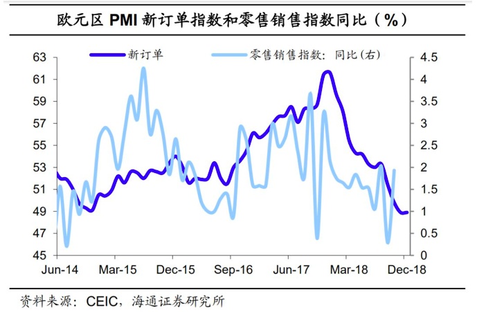 前期油价上涨和社会局势动荡导致其国内消费萎靡。欧元区零售销售指数与新订单走势一致,相比于17年2-3%的同比增速,18年同比一直处于2%以下,印证国内需求不佳。欧元区国内需求不好由多方面因素导致,其一,前期国际原油价格大幅上涨导致汽车销售出现明显恶化,9月欧元区机动车销售额同比下降至2.1%,远低于17年末的9.3%。其二,欧洲社会局势动荡,英国退欧、意大利财政预算争端、法国黄背心运动等都导致居民生活受到影响,抑制了消费。