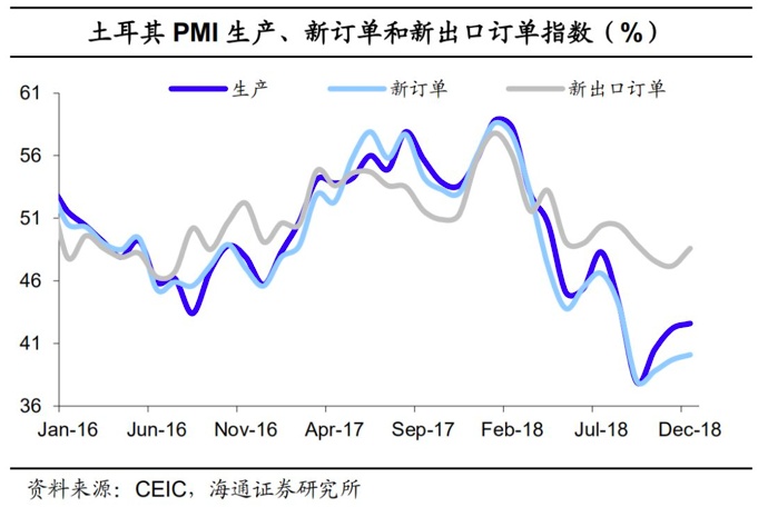 土耳其内需大幅下滑,拖累经济。从土耳其的PMI指数分项来看,18年新订单指数和新出口订单指数均出现回落,全年两者分别下降15.9和7.1个百分点。新订单指数下降幅度明显大于后者,反映出土耳其内需疲软是经济恶化的主要原因。受其影响,生产指数也从18年1月的58.8下降至12月的42.6。