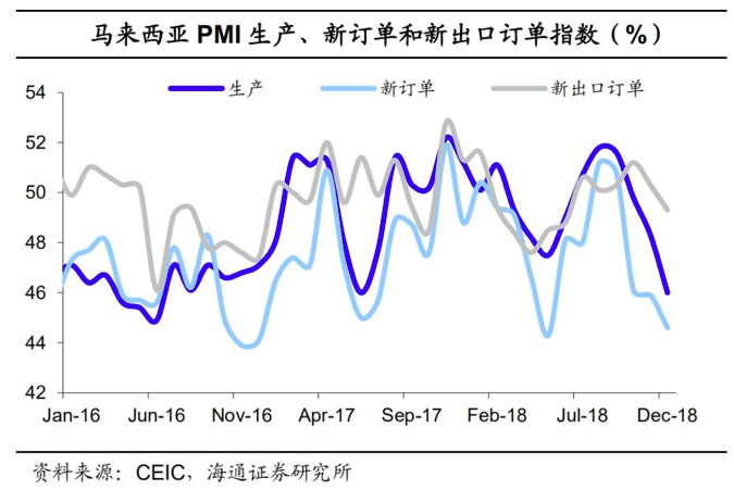 与土耳其一样,马来西亚也出现了内需大幅下滑的情况。18年下半年,马来西亚的PMI新订单指数出现明显下滑,最近三个月累计下降6.2个百分点。需求的快速下降带动工业生产出现明显回落,12月生产指数已经下降至46。与新订单指数相比,新出口订单下降幅度较小,主要原因是18年以来马来西亚林吉特兑美元汇率贬值不少,在一定程度上刺激出口。