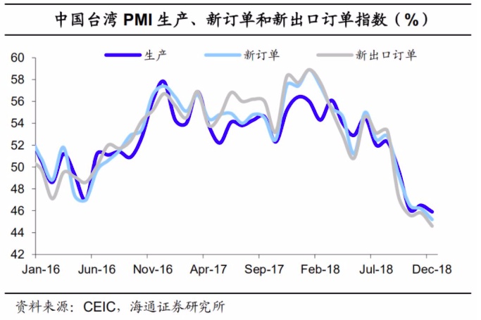 而中国台湾的问题在于内需外需交困。18年中国台湾的PMI新订单指数和新出口订单双双下滑,两者分别累计下降-12.2和-13.1个百分点,受需求疲软影响,生产指数也下降10.5个百分点。中国台湾出口下滑与中国大陆和欧洲经济走弱和贸易冲突升级相关,11月对中国大陆和欧洲的出口同比分别下降至-3.4%和-4.2%。同时,作为中国台湾的支柱行业,18年通讯电子行业整体表现不佳,导致台湾地区内部需求也受到较大影响。