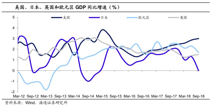 2019年全球经济走弱的故事或还会延续。发达国家作为全球经济的重要引擎,各国有各国的忧虑。首先,19年美国经济或难以持续强劲复苏态势,一方面是因为减税政策效用边际减弱,另一方面是18年美联储4次加息对经济的冲击开始显现。其次,欧洲民粹主义的崛起,本质上是欧洲的高福利与经济增长放缓之间难以调和的矛盾,因此欧洲的社会局势动荡并没有减弱,今年可能还会出现黑天鹅事件,并且英国退欧的影响还未完全发酵。最后,日本经济已经受累于出口下降,而19年10月日本计划提高消费税率又将导致其国内消费出现回落。