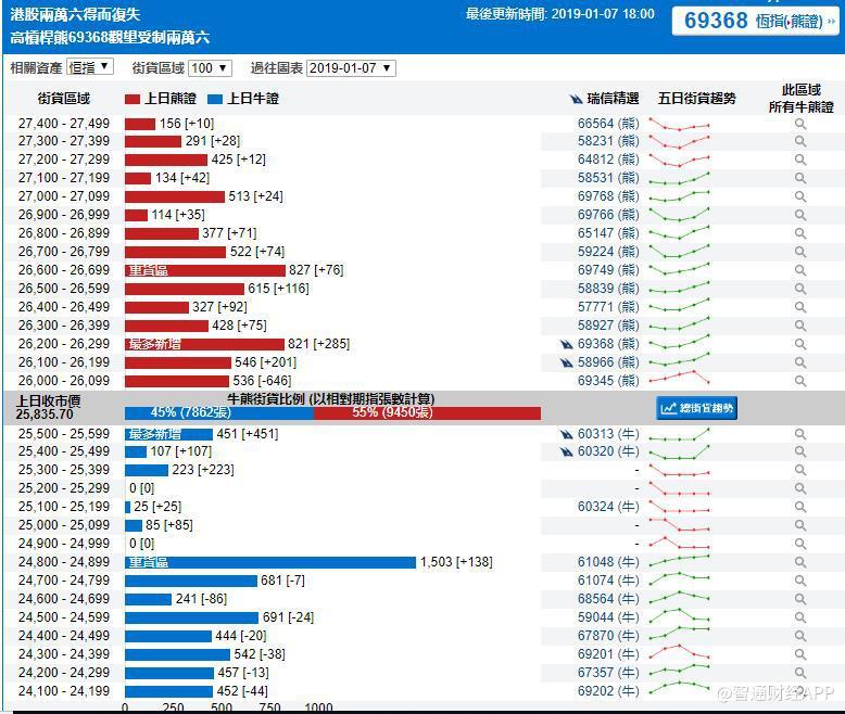 智通财经APP获悉,截至1月7日,恒指最新的牛熊街货比例45:55。从瑞信恒指牛熊证街货分布图中得到的数据显示,熊证街货重货区在26800-26899区间,该区间最新熊证数量为827张,新增76张,最多新增在26200-26299区间,新增285张。牛证街货重货区在24800-24899区间,该区间最新牛证数量为1503张,比上一交易日增加138张。最新新增在25500-25599区间,新增451张。