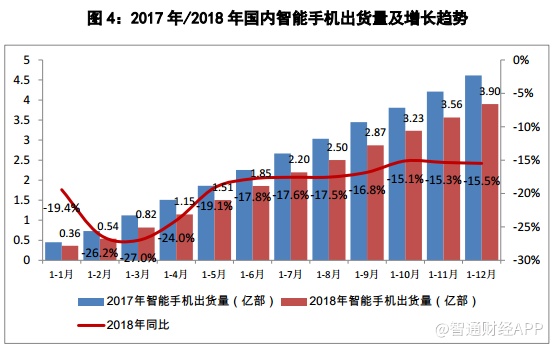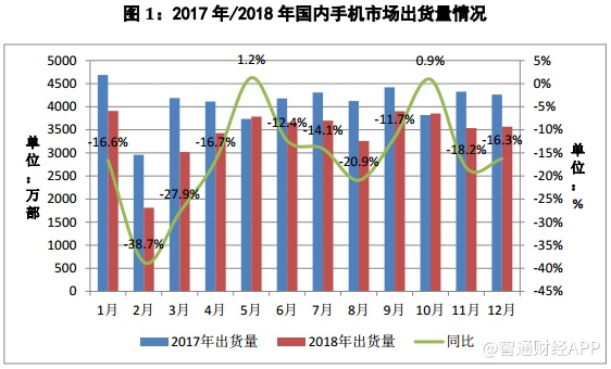 2018年全年,智能手机出货量3.90亿部,同比下降15.5%,占同期手机出货量的94.1%,其中Android手机在智能手机中占比89.3%。