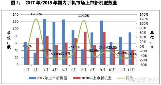 国内手机市场上市新机型数量。2018年12月,上市新机型42款,同比下降53.3%,环比增长7.7%,上市新机型中含2G手机5款、4G手机37款。