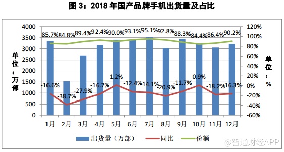 2018年全年,国产品牌手机出货量3.71亿部,同比下降14.9%,占同期手机出货量的89.5%;上市新机型695款,同比下降29.4%,占同期手机上市新机型数量的91.0%。