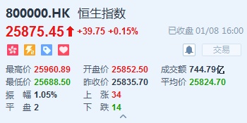 智通财经APP获悉,恒指早盘高开0.07%,报25852.5点。截至收盘,恒生指数涨39.75点或0.15%,报25875.45点,全日成交额达744.79亿。国企指数涨0.1%,报10133.74点,红筹指数涨0.47%,报4151.54点。