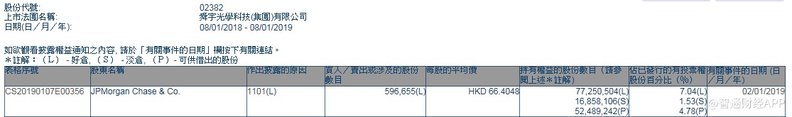 智通财经APP获悉,根据联交所资料显示,摩根大通于2019年1月2日增持舜宇光学科技(02382)59万股,每股作价66.40港元,总值约3917.6万港元,最新持股量增至7.04%,最新持股数目7725万股。
