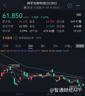 截至今日收盘,舜宇光学科技(02382)报61.85港元,跌1.67%。
