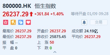 智通财经APP获悉,恒生指数开盘涨1.4%,报26237.29点。国企指数涨1.44%,报10279.68点。红筹指数涨1.25%,报4203.57点。大市盘前成交24.19亿港元。