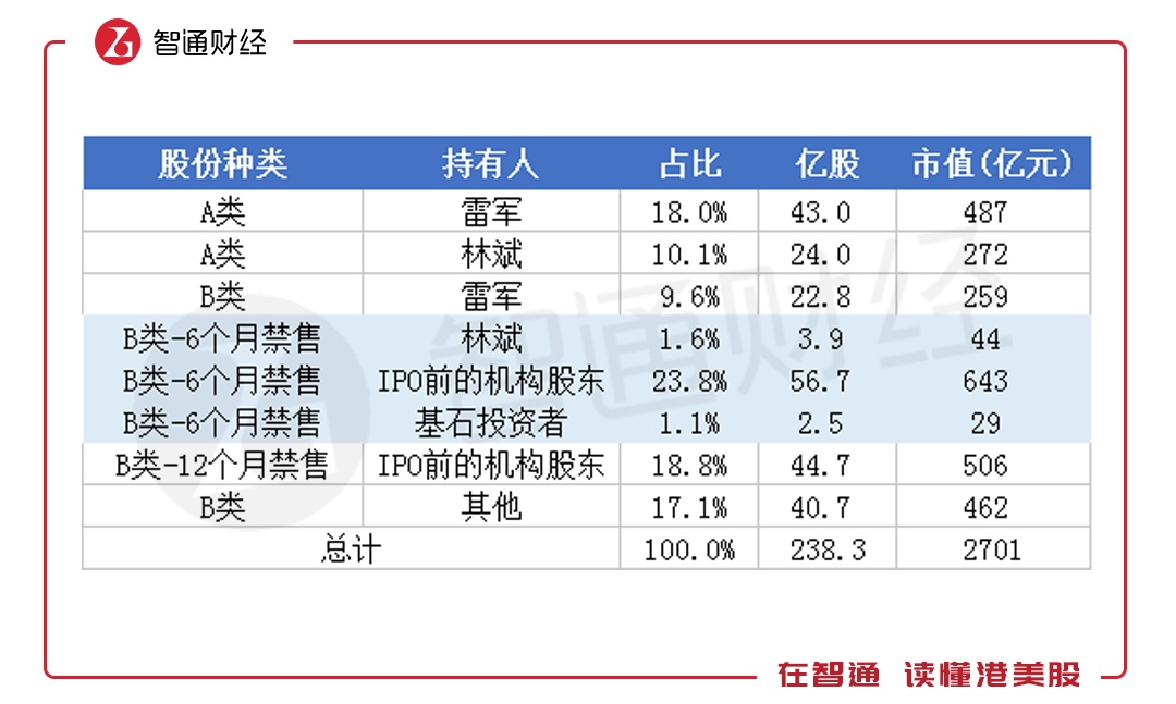 据小米公告的数据显示,该批禁售期到期股份约占小米公司总股本的25%,另一批12个月禁售期的股份则占约20%。