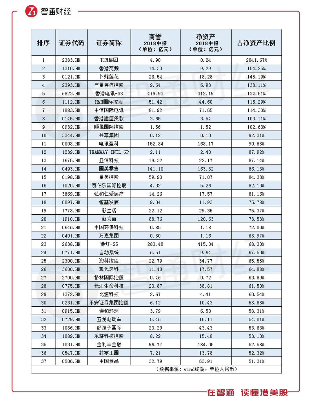 智通财经APP梳理出,截至2018年中报,港股主板上市公司中,商誉超过公司净资产的公司就已经高达9家,其中商誉占净资产比例超过50%的公司达到37家。