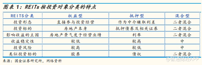根据REITs的投资对象不同,REITs可划分为权益型、抵押型和混合型三种,其中权益型REITs占主导地位。