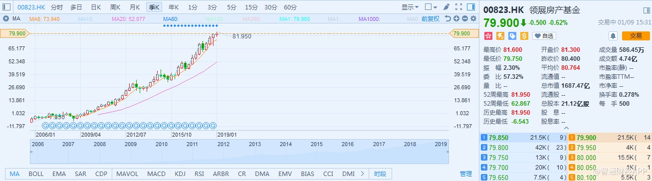 从港股上市REITs的历年表现看,在绝大多数年份,REITs年度收益跑赢大盘。比如领展房产基金(00823)2005年11月上市,上市价格为11.8港元,目前前复权价格为80港元,仅仅依靠股价上涨,就能获得超过15%的年化收益率。2018年,恒指下跌13.61%,但领展房产基金上涨13.51%,置富产业信托(00778)仅跌1.68%。
