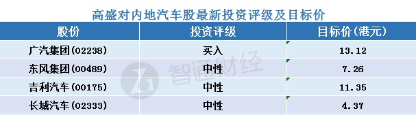 三、高盛对内地汽车股最新投资评级及目标价汇总