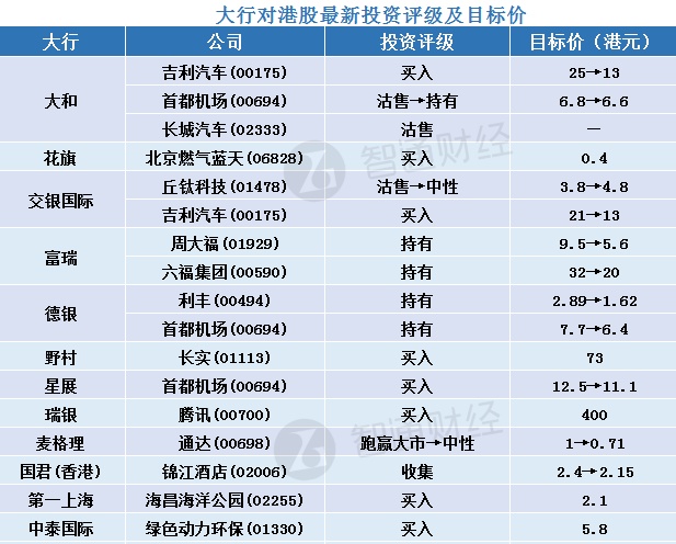 五、大行对港股最新投资评级及目标价汇总