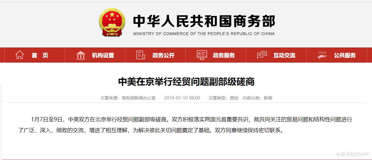 智通财经APP获悉,据商务部网站消息,1月7日至9日,中美双方在北京举行经贸问题副部级磋商。双方积极落实两国元首重要共识,就共同关注的贸易问题和结构性问题进行了广泛、深入、细致的交流,增进了相互理解,为解决彼此关切问题奠定了基础。双方同意继续保持密切联系。