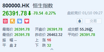 智通财经APP获悉,恒生指数开盘低开0.27%,报26391.78点。国企指数跌0.32%,报10325.45点。红筹指数跌0.58%,报4205.32点。大市盘前成交55.26亿港元。