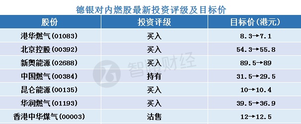 德银调整内地燃气股目标价(见下表),并预计今年行业的波动性将会持续。行业中,德银首选新奥能源(02688),给予“买入”评级,目标价由89.5港元略降至89港元,该行称新奥能源有利的地理分布、来自液化天然气的盈利及综合能源业务等可为公司面对2019年风险时带来缓冲空间。