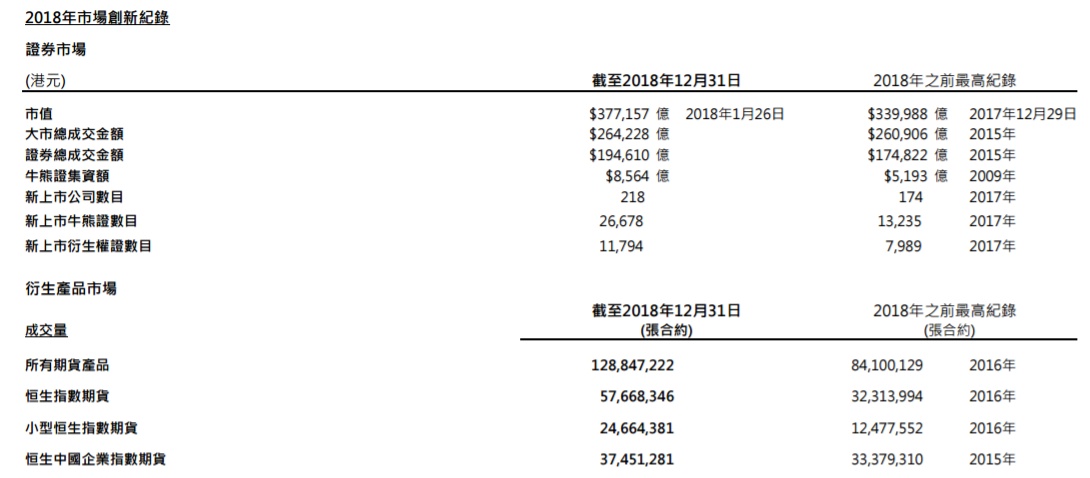全年证券市场成交额创纪录达到264228亿港元,超越2015年的260906亿港元。证券成交额也达到194610亿港元,刷新2015年174822亿港元的记录。而2018年1月26日亦达到377157亿港元的市值巅峰,此前最高是2017年12月29日的339988亿港元。