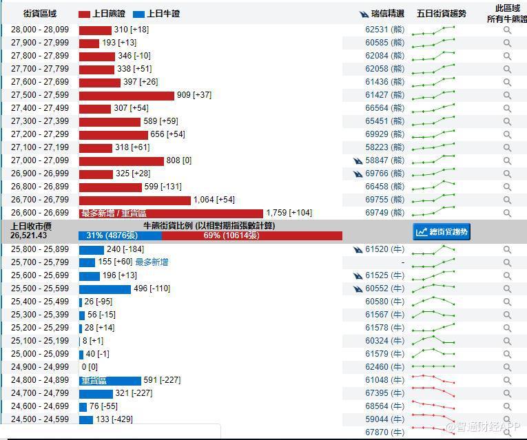 智通财经APP获悉,截至1月10日,恒指最新的牛熊街货比例31:69。从瑞信恒指牛熊证街货分布图中得到的数据显示,熊证街货重货区在26600-26699区间,该区间最新熊证数量为1759张,新增104张,最多新增在同一区间。牛证街货重货区在24800-24899区间,该区间最新牛证数量为591张,比上一交易日减少227张。最新新增在25700-25799区间,新增60张。