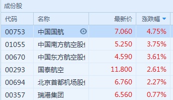 智通财经APP获悉,在岸人民币突破6.77关口,航空股集体上涨,截至10时05分,中国国航(00753)涨4.75%,报7.06港元,南方航空(01055)及东方航空(00670)均涨超3%,国泰航空(00293)涨2.61%,首都机场(00694)涨2.27%。